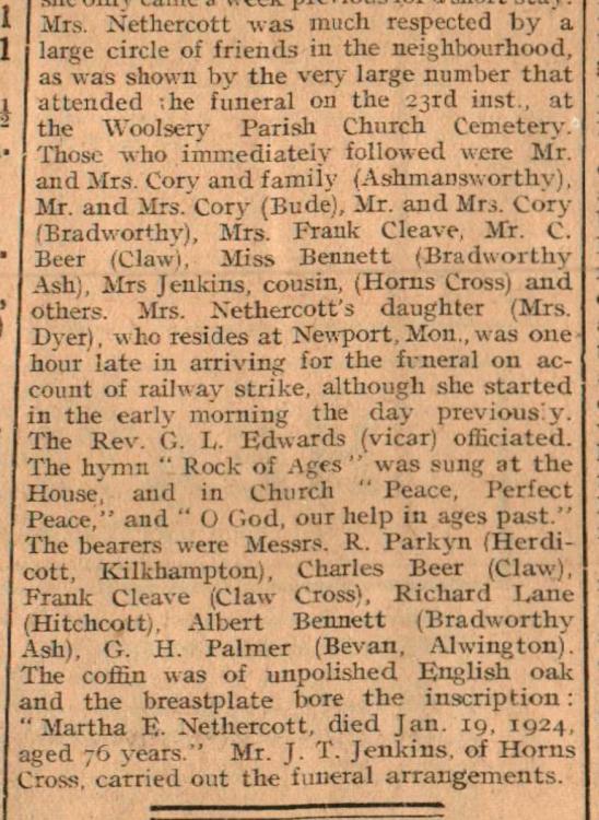 We regret to record the death of Mrs Martha E Nethercott, whose end came very suddenly at the residence of Mr and Mrs John Cory, Ashmansworthy, Woolsery, where she only came a week previous for a short stay.