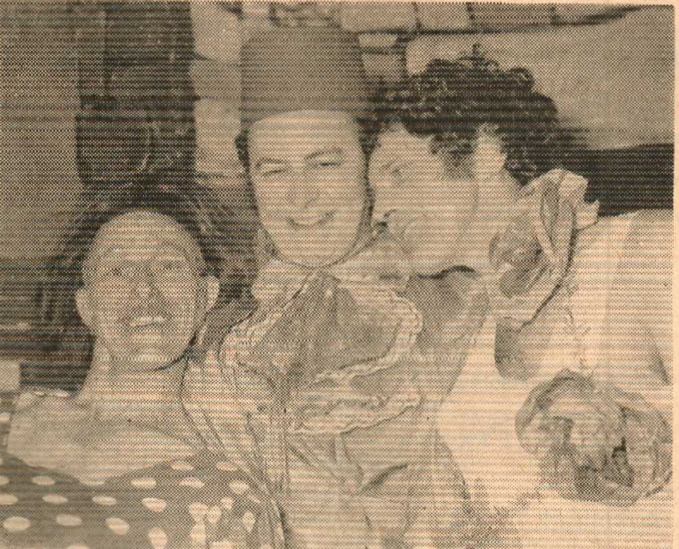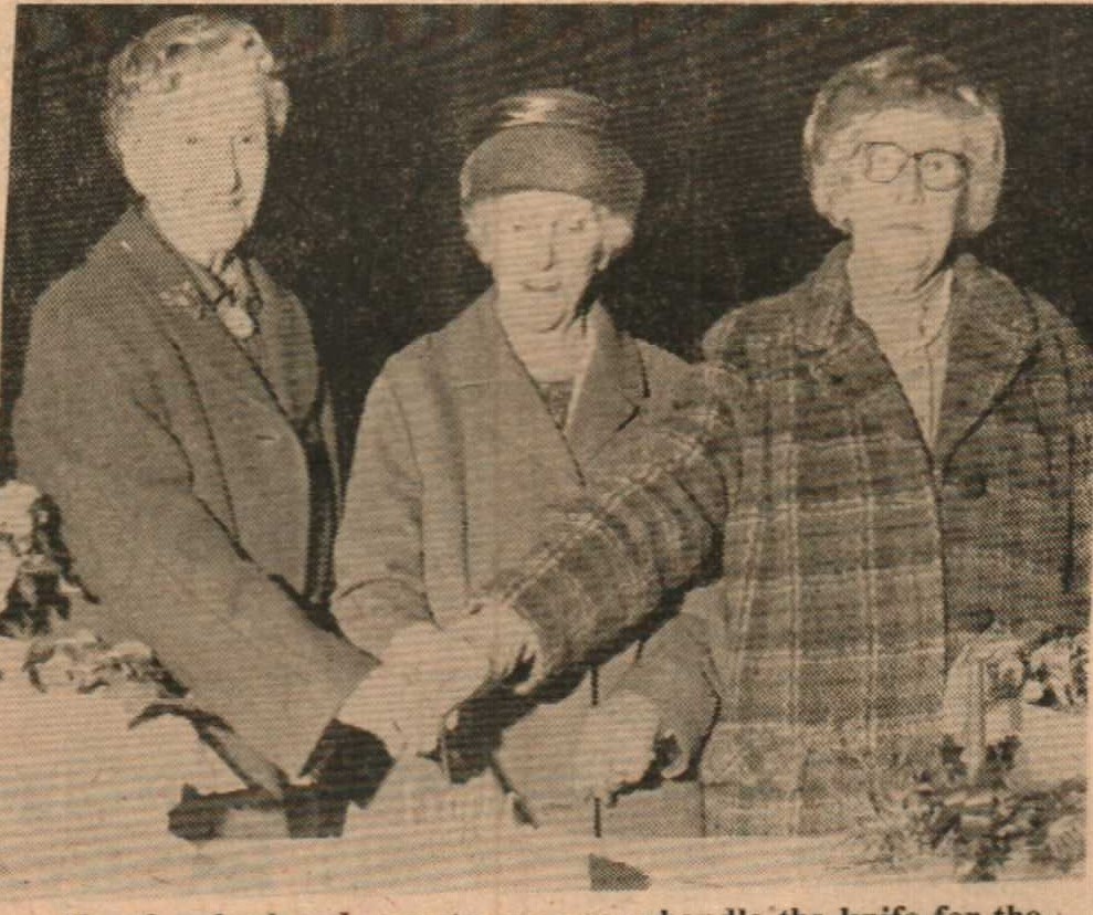 Two hundred and seventy-one years handle the knife for the cutting the cake ceremony at Appledore Darby and Joan Club party. Left to right – Mrs Bridger, Mrs Gayette and Miss Willard. The Appledore club has been in existence for 16 years, but as with most clubs of this kind, there is a shortage of Darbys!