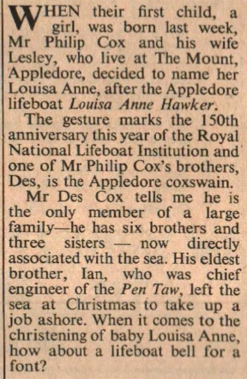 Philip and Lesley Cox name their daughter after the Appledore lifeboat - Louisa Anne Hawker.