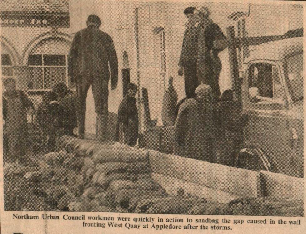 Workmen are expected to rebuild the parapet of the wall at West Appledore which was savaged in the gales. There were slight signs of a bulge in this wall and further examination would be made to assess the seriousness or otherwise.