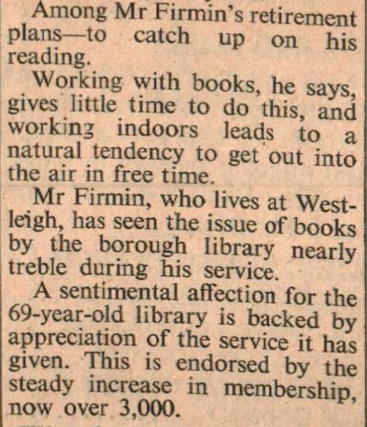 On April 1, changeover day in local government, Bideford’s library will be absorbed into the county library. This also brings the retirement as borough librarian of Mr Lloyd Firmin, who has held the post for practically 12 years.
