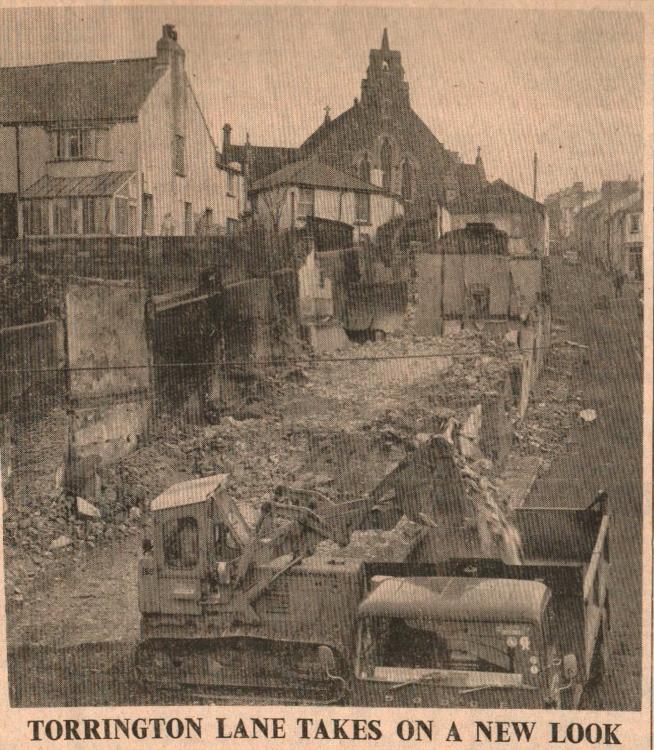 A new vista, topped by St Peter’s Church, opens up at Torrington Lane, East-the-Water, with the completion of the demolition under a clearance order of 22 houses. It marks the half-way stage of redevelopment in this vicinity that has been in the pipeline for some years. Two-storey flats for old people, with a warden scheme, are to be built this year on the site. Occupants of the cleared area have been rehoused by Bideford Town Council. Other new housing will also be provided nearby, utilising another cleared site.