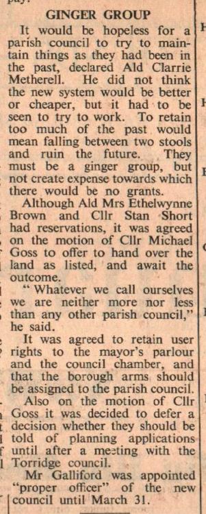 All the town’s assets other than historic and ceremonial articles and the town band instruments are to be handed over by Bideford Town Council to the Torridge District Council when that body takes over on April 1 next. But Bideford will still have a town council and elect a town mayor. It was decided to retain the chains of the mayor and mayoress; informal badges of office; the maces; the mayor’s, aldermen’s councillor’s and macebearers’ robes; the borough plate; the town crier’s bell, staff and uniform; mayoral portraits; and any other identifiable ceremonial items and other articles given to the council, museum, library, etc. To be offered to the new council are: Trick’s, Love Lane and Pollyfield allotments; the cemetery; Old Town cemetery; Pollyfield, Chudleigh Fort; Victoria Park, river bank, meadow parkland, Stucley gift of marshes; King George’s Field, Pollyfield, Reed’s Field and Sports Ground; Hartland Road plantation; cattle market; and pannier market.
