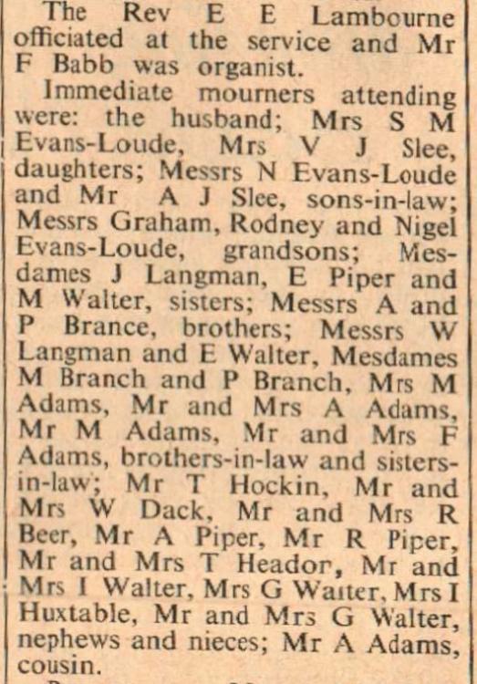 The funeral of Mrs Gertrude Adams, the wife of Mr Sydney Adams of 2 Ashtons, has taken place at Buckland Brewer Methodist Church. Bearers were Messrs M Blight, J Daniel, B Slee, T Brown, G Ferritt and L Blight.