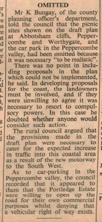 Differences of opinion between the planning authority and Bideford Rural Council about the outline development plan for the coastal strip from Bucks Mills to Westward Ho! have been discussed by the council’s planning committee and an officer of the county planning authority. But the differences have not been resolved and the matter is now to be left for the Torridge District Council to consider.