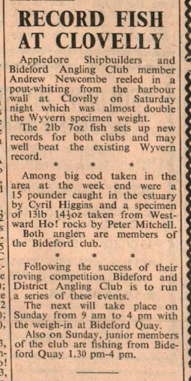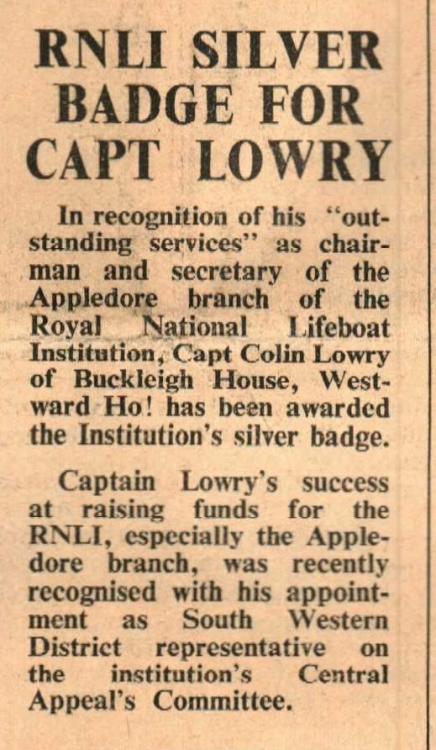 A model of Clovelly lifeboat in a glass case, made by one of the lifeboatmen, Mr B Tanner, was won in a draw by T Brewer of Birmingham. The draw was made at the Ladies’ Lifeboat Guild annual New Year whist drive, held in the parish hall. Local winners included Mr Abbott (Highford), Mrs Hayes and Mrs Howell. At the whist drive Mr G Smith was MC and Mrs Seden door steward. The prizes were distributed by the Hon. Mrs K Rous.