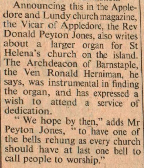 All of the Woolsery parish church’s six bells will need to be recast. To meet the extra costs it is planned to invite residents and other friends of the parish to donate £200 a time to pay for each bell’s re-casting. For this, the bell can bear the donor’s name or that of the person in whose memory the donation has been made. The bells are to be re-cast by Messrs Taylor, of Loughborough, who cast them 148 years ago when the firm had a branch at nearby Buckland Brewer. Removal of the bells and their eventual re-erection is being undertaken by Mr Arthur Fidler, of Bow, Devon, who is one of only four bell-hangers in the country. While by church history standards they are not very old, they have interesting features - in having four loops (known as cannons) on top of the bells instead of the usual six. Mr Fidler has recently worked on the Winkleigh and Yarnscombe bells.