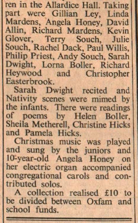 Fifty children and 30 adults attended a party at the Community Centre, Bideford, given by the Torridgeside Opportunity Group. Games were organised by Mr Punt from the Lampard Vachell School, Barnstaple. Father Christmas was in attendance.