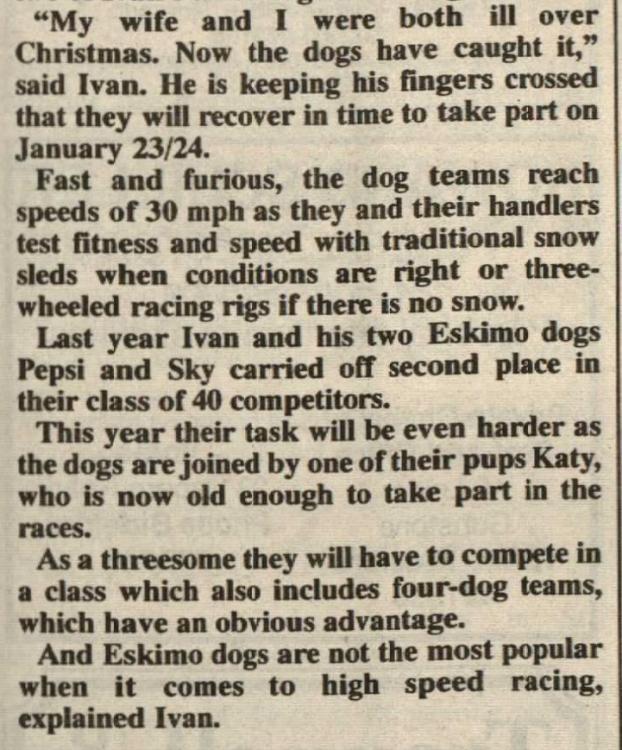 The flu bug could bring to an end the hopes of Torrington ‘musher’ Ivan Passmore and his team of huskies gaining success in one of Britain’s top sled-dog competitions. Ivan and his dogs are scheduled to go to Aviemore in Scotland at the end of the month to compete against 200 competitors in the Beta Siberian Husky Club Rally. But their trip is threatened because two of Ivan’s three dogs have caught the flu.