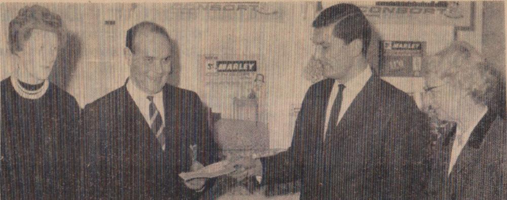 Presenting Mr Giddy with the cheque is Mr J B Hodgson, assistant sales manager, of the Marley retail division. On the right is Miss P Gammon, director of Rawle, Gammon and Baker Ltd.